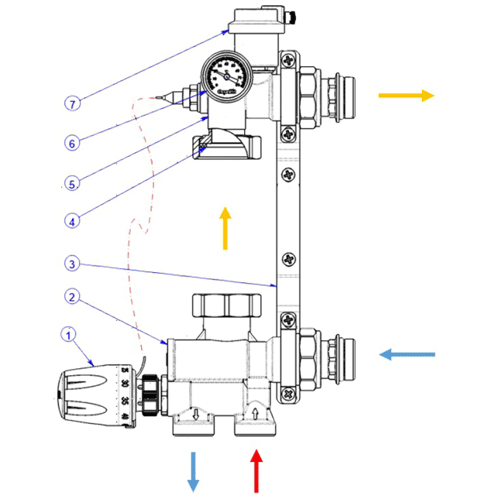 С помощью циркуляционного насоса теплоноситель со смешанной температурой поступает в верхний корпус (5), а затем на подающий коллектор низкотемпературной системы отопления. Регулирование значения смешанной температуры производится с помощью термостатической головки (1). Замер температуры происходит с помощью выносного датчика, который устанавливается в верхнюю часть корпуса (5). Два корпуса собираются на кронштейне (3). Значение температуры теплоносителя поступающего в низкотемпературный контур можно увидеть с помощью контактного термометра (6). Функция удаления воздуха осуществляется с помощью автоматического вертикального воздухоотводчика (7). Для корректной работы группы необходимо обеспечить минимальный перепад давления не менее ОД бара между подающим и обратным трубопроводом к первичному контуру системы отопления. В нижнем корпусе (2) располагается байпас с диапазоном настройки от 0 до 5. Он находится сбоку возле термоголовки (1).