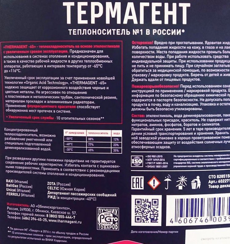 *10 отопительных сезонов — срок эксплуатации, определенный по результатам испытаний во ВНИИ Коррозии. Срок службы теплохладоносителя также зависит от режима его эксплуатации. Не рекомендуется доводить теплохладоноситель до состояния кипения (температура кипения при атмосферном давлении составляет +106°С — +116°С, в зависимости от степени его разбавления водой).